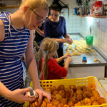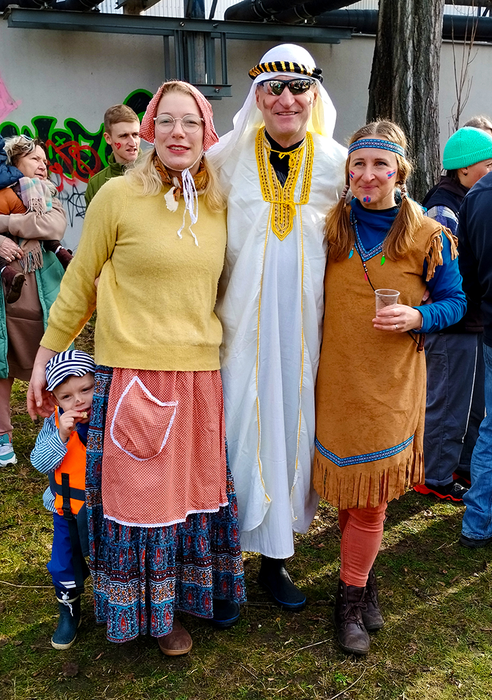 V průběhu zastávky v parku v Polní byl čas na přátelské „posezení“, ale hlavně na občerstvení, které někteří sousedé dodali nad rámec našich komunitních koblih. Byly tak zde k ochutnání zelňáky, chléb s domácím sádlem a cibulí, buchty, muffiny, teplé nápoje a prosecco. Mimo jiné zde byl čas na prohlídku a focení masek, ve kterých se většina účastníků vydala na plavbu.