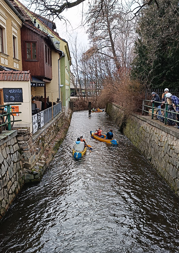 Ve druhé části plavby přivedla stoka plavidla do centra, kde neunikla kolemjdoucím, kteří se zájmem obdivovali masky, a zdravili se s nimi. Tedy pokud zrovna nebyly před zraky diváků ukryté v tunelu pod Senovážným náměstím. Není to vůbec od věci, poznat Budějce z jiného úhlu pohledu, než je ten každodenní.
